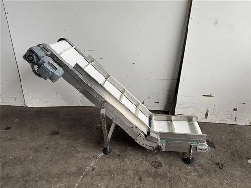 NNP Flighted elevator conveyor, Stainless, elevates from 200mm to 1000mm, belt width 350mm, with side guides, 3Ph