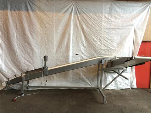 Lot 389 NNP Stainless inclined transfer conveyor with 90degree inclined outfeed conveyor, conveyor one overall length 4m from 450mm to 1450mm then onto conveyor two overall length 2.2M from 1000mm to 1500mm. Conveyor width 400mm.