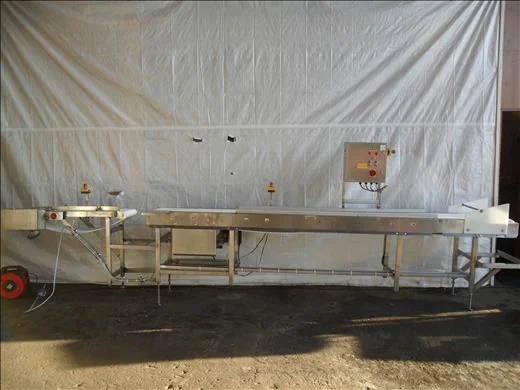 Lot 279 NNP Sorting conveyor Stainless conveyor, variable speed, first conveyor 3650mm x 300mm, second conveyor 1110mm x 300mm, 200mm gap inbetween two conveyors.