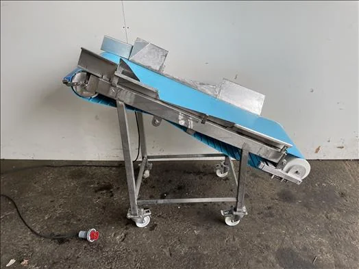 Stainless frame, elevates from 500mm to 1100mm, belt width 500mm, overall length 1400mm, stainless side guides, mobile, 3Ph