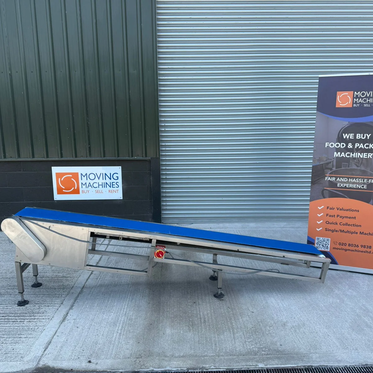1 x Inclined conveyor with height adjustable feet, single-speed. Previously used as an outfeed conveyor for a VFFS bagging machine.