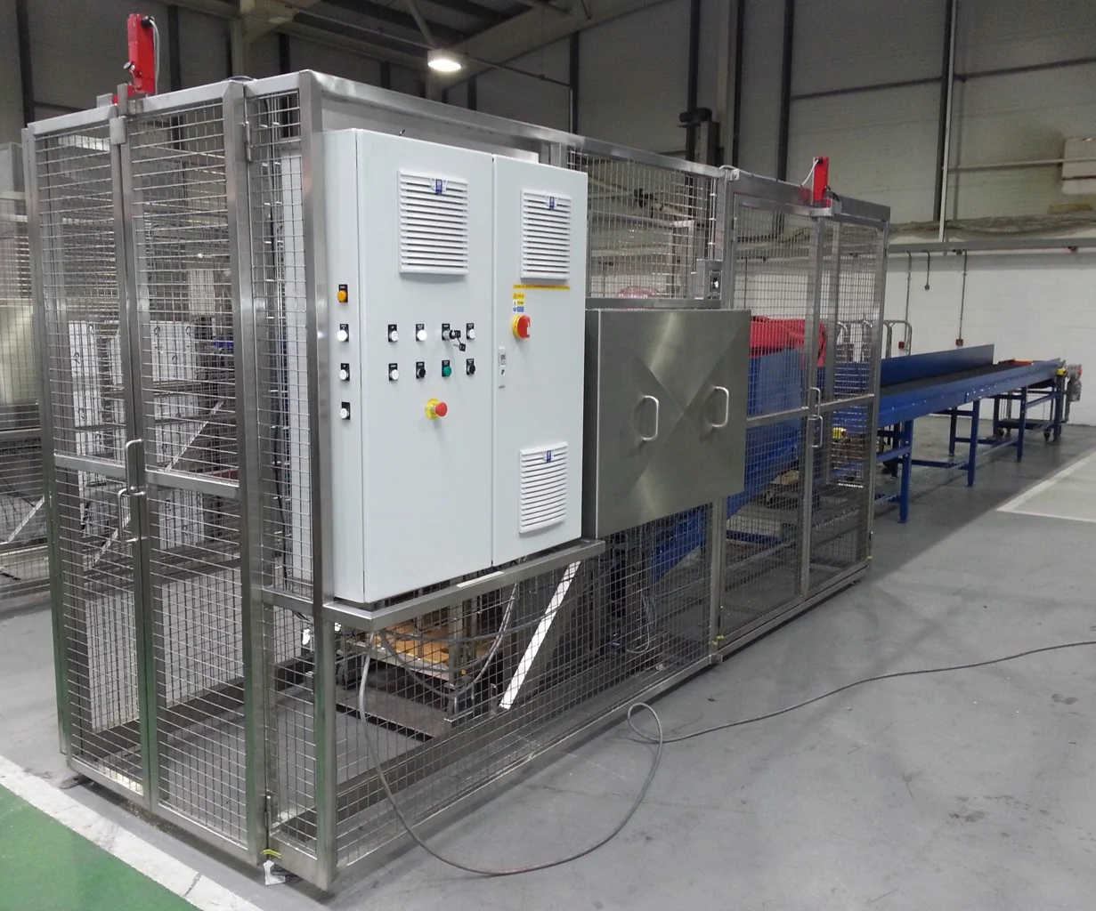 BTM/250/1000/B/G Parcel Container TipperThis Parcel Container Tipper is designed to lift and tip the Royal Mail York Container at a discharge height of 1000mm generally as per our Layout Drawing BP3741-1B. The Parcel Container Tipper is a fully welded steel construction and is designed to be bolted to the floor. This Parcel Container Tipper would be powered via a Helical Bevel gearbox and would tip the York Containers to an angle of 180 degrees. The Parcel Container Tipper would be wheeled into lift frame and would be raised by rotation of the lifting carriage by the motor gearbox. As the York Container is tipped over, the discharge of mail and parcels will be in a controlled manner to a full tip angle of 180 degrees. The York Container would be securely retained in the lift carriage in the fully tipped position. Safety Guard to BS EN 14120:2015 Safety of Machinery GuardsThe safety guard is constructed from 40 x 40 x 3mm box section and 3mm wire, 40mm aperture weld mesh to meet the guidelines of BS EN 14120:2015 Safety of Machinery Guards. It encloses the Parcel Container Tipper to a height of 2200mm on two sides, 1000mm at the tipping side with a pair of interlocked hinged guard doors on the fourth side. The guard doors are electrically and mechanically interlocked to prevent the Parcel Container Tipper from operating if either door is open. Additionally, the guard doors can only be opened when the lift carriage is at the full down position to prevent access whilst a load is raised. Also included is an additional electrically interlocked safety guard door that will allow access into the side of the safety guard at the tipping area to retrieve any parcels that may fall out at this position and also to allow access for cleaning and maintenance to take place. Parcel Container Tipper Electrical ControlThe Parcel Container Tipper is fitted with an IP65 Stainless Steel Control Panel which is mounted on the safety guard at a convenient position to give good maintenance access under the Provision and Use of Work Equipment Regulation 1998 (PUWER). The control panel incorporates all of the controls for the tipper and conveyor. The proposed parcel container tipper operation is as follows:-