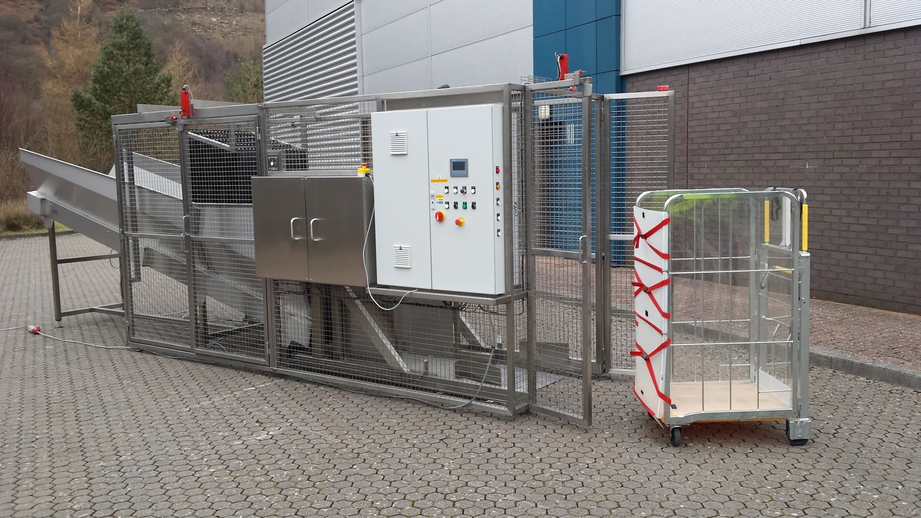 BTM/250/1000/B/G Mechanical Parcel Handling SystemThis Mechanical Parcel Handling System is designed to lift and tip the Royal Mail York Container at a discharge height of 1000mm. The Parcel Handling System is a fully welded steel construction and is designed to be bolted to the floor. This Parcel Handling System would be powered via a Helical Bevel gearbox and would tip the York Containers to an angle of 170 degrees. The Parcel Handling System would be wheeled into the lift frame and would be raised by rotation of the lifting carriage by the motor gearbox. As the York Container is tipped over, the discharge of mail and parcels will be in a controlled manner to a full tip angle of 170 degrees. The York Container would be securely retained in the lift carriage in the fully tipped position. Safety Guard to BS EN 14120:2015 Safety of Machinery GuardsThe safety guard is constructed from 40 x 40 x 3mm box section and 3mm wire, 40mm aperture weld mesh to meet the guidelines of BS EN 14120:2015 Safety of Machinery. It encloses the Parcel Handling System to a height of 2200mm on two sides with a pair of interlocked hinged guard doors on the fourth side. The guard doors are electrically and mechanically interlocked to prevent the Parcel Handling System from operating if either door is open. Additionally, the guard doors can only be opened when the lift carriage is at the full down position to prevent access whilst a load is raised. There were also a pair of electrically interlocked safety guard doors that allowed access into the side of the safety guard at the tipping area to retrieve any parcels that may fall out at this position and also to allow access for cleaning and maintenance. Infeed ConveyorThe Parcel Handling System discharged into a Hopper mounted on the infeed end of an Inclined Conveyor. Parcel Handling System Electrical ControlThe Parcel Handling System is fitted with an IP65 Stainless Steel Control Panel which is mounted on the main frame at a convenient position to give good maintenance access under the Provision and Use of Work Equipment Regulation 1998 (PUWER). It incorporates all of the controls for the Tipper and the Inclined Infeed Conveyor. Both the Tipper and the Conveyor Control were controlled by Inverters to allow for speed control. The Parcel Handling System uses a Rotary Position Sensor to stop at the full up and full down positions. It also uses Over Travel Proximity Sensors which are independent of the Rotary Sensor. The Control Panel is fitted with a HMI that also allows various features including:- • Adjustment of the Full Up position • Adjustment of the Full Down position • A Tipper Counter • Selection of the Mail Sweep Mode The Tipper control sequence is as follows:- • The York Container is loaded into the parcel handling system and the Guard Door closed • There is a photo sensor inside the safety enclosure that senses that the York Container is loaded correctly before the container can be tipped • The Control On button is pressed followed by the System Start button which would cause the parcel handling system to lift and tip • The tipping cycle is automated so that once the full up position is reached and all of the mail is tipped out, the parcel handling system will return to the full down position to allow the empty York to be replaced • The guard gate interlock switch is released via a ‘Guard Release’ push button which allows the safety guard door to be opened • The empty container can then be removed and replaced with a full container and the whole cycle repeated Mail SweepThere is a safe method of entering the safety enclosure to retrieve any mail that may have dropped to the floor within the enclosure. The procedure is as follows:- • An Engineer will select the Mail Sweep mode using the HMI and then drive the lift carriage to the full up position using a hold to run key switch • Once the tipper activates both the Full Up position on the Rotary Sensor and then the Over Travel Proximity Switch, the parcel handling system will stop and the motor gearbox brake will automatically engage preventing the parcel handling system from moving • The Engineer can now use the Guard Release Button to open the Safety Guard Gate • As soon as the Interlock is released, the tipper safety circuit is disabled preventing the parcel handling system from operating • With the safety circuited disabled it is now safe to enter the safety enclosure and retrieve any mail • Once the mail is retrieved, the safety guard door is closed and the Engineer uses the key switch to drive the parcel handling system to the full down or home position • Once at this position, normal operation can be resumed |