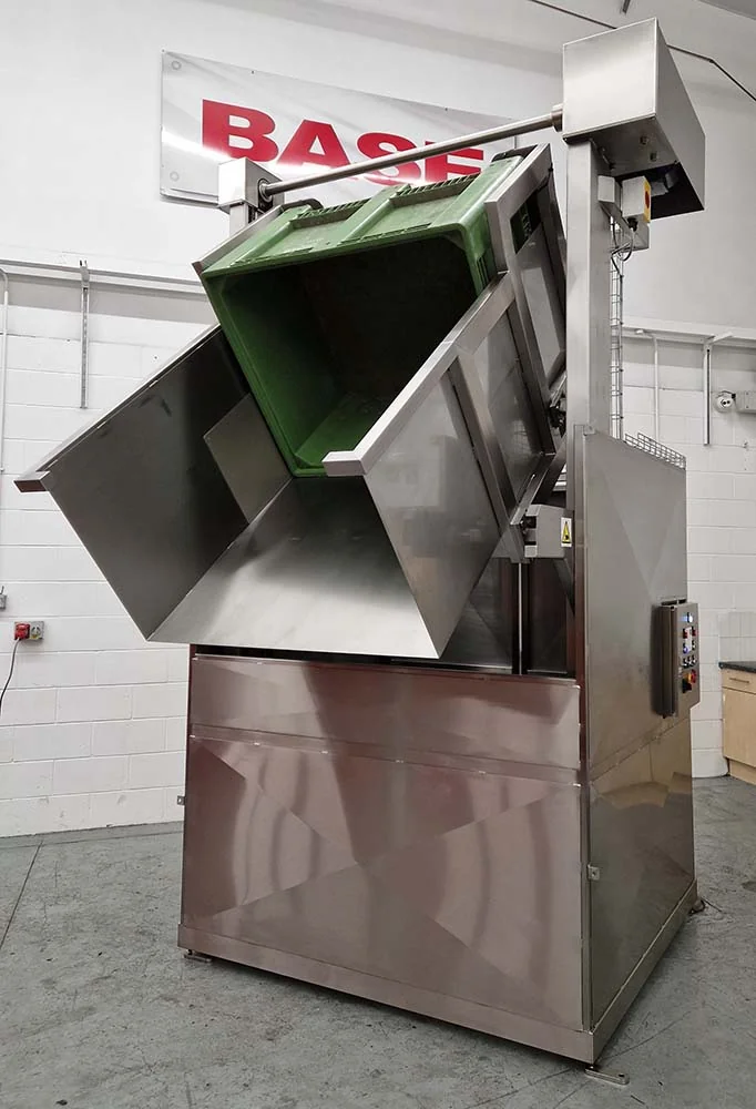 BTM/2P/750/1400/B/G Parcel TipperThis Parcel Tipper was designed to lift and tip a 750 Kgs Pallet Box of Parcels (1200mm L x 1000mm W x 1500mm H) at a discharge height of ¬1400mm. The Parcel Tipper is manufactured from Grade 304 stainless steel, is a welded construction throughout and is designed to be bolted to the floor. The lifting is accomplished via chains driven by a motor gearbox mounted at the top of the one column with a crossover shaft to the other column. The parcels are tipped onto a V shaped divider plate in the hopper to guide the parcels onto two separate outfeed conveyors. Safety Guard to BS EN 14120:2015 Safety of Machinery GuardsThis Parcel Tipper was supplied complete with a safety guard to meet the guidelines of BS EN 14120:2015 Safety of Machinery Guards. The safety guard is constructed from 40 x 40 x 3mm stainless steel box section and 2.0mm stainless steel sheet. It encloses the Parcel Tipper to a height of 2200mm on two sides, 1200mm at the tipping position with a pair of hinged guard doors on the fourth side. The guard doors are electrically and mechanically interlocked preventing the Parcel Tipper from operating when the door is open. Additionally, the guard doors can only be opened when the lift carriage is at the full down position to prevent access whilst a load is raised. The safety guarding extended down each side of the hopper at the tipping position to prevent access around the end of the guard. Parcel Tipper Electrical ControlThis Parcel Tipper is fitted with an IP65 Stainless Steel Control Panel which is mounted on the Safety Guard at a convenient position to give good maintenance access under the Provision and Use of Work Equipment Regulation 1998 (PUWER). The control panel incorporates the following controls; Up, Down, Guard Release, Emergency Stop and a Reset Facility. Upper and Lower end of travel limit switches are positioned to prevent inadvertent adjustment or damage but are easily adjustable by trained personnel for fine adjustment on site. The guarded Parcel Tipper operation is latched so that pressing the ‘Up’ push button once will raise the lift to the full tip position. Once the product has been discharged, pressing the ‘Down’ push button once will return the Parcel Tipper to the full down position. The control panel has a volt free pair of contacts which can be used to connect a ‘Call to Run’ signal if required. |