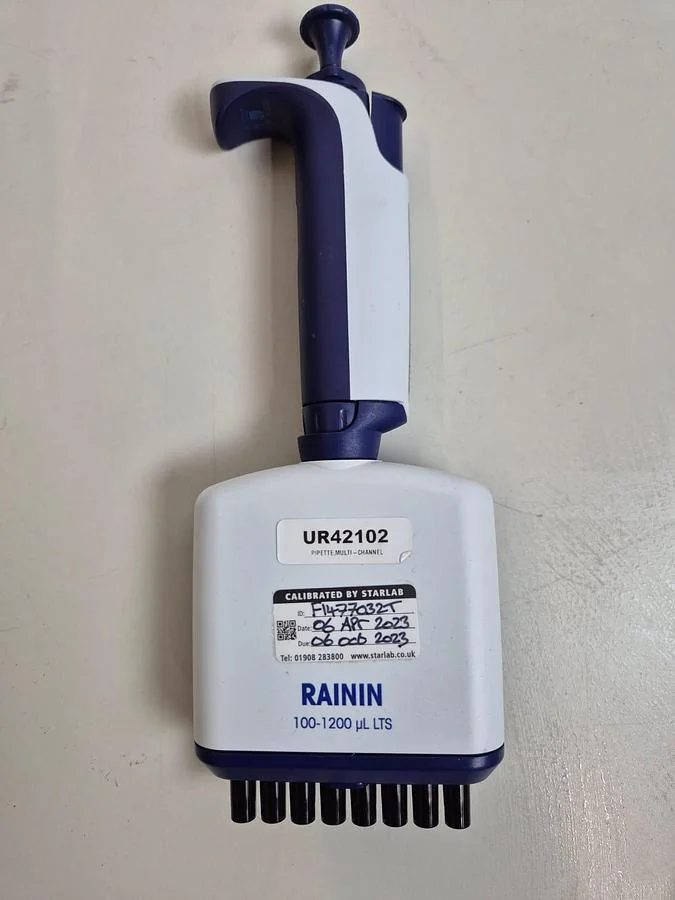 This listing is for the RAININ Pipet-Lite XLS L-1200 8 Chanel Pipetter (Button Colour-code Blue 100-122 LTS