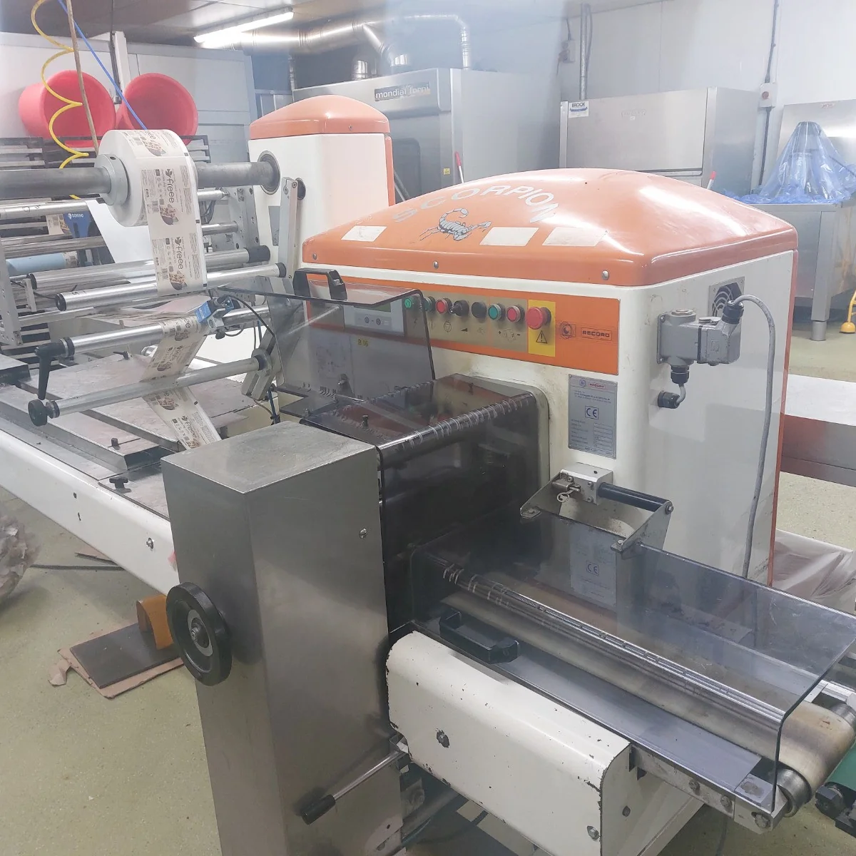 1 x Record Packaging Machinery flow wrapper with infeed conveyor. Fitted with an adjustable folding box, this unit is suitable for wrapping a variety of products in printed or clear film.