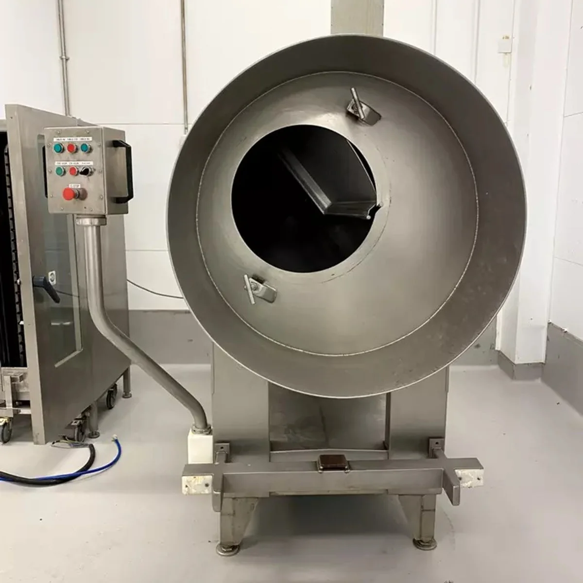 1 x Rewi stainless steel vacuum tumbler with mobile unloading table. The vacuum tumbler features forward and reverse rotation / mixing, perfect for mixing and marinating meat, poultry and a variety of other products.