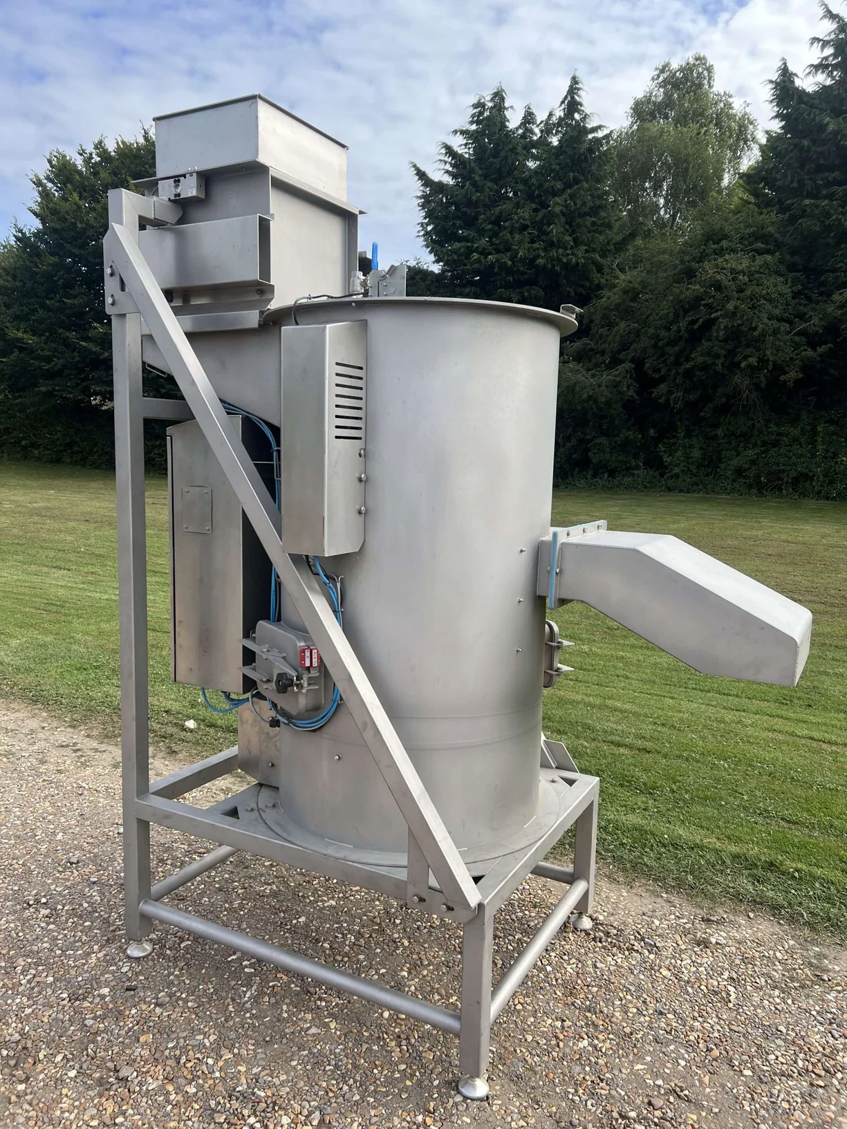 Second hand batch peeler for sale. As new, never been used batch peeler, this peeler has the capacity to peel 50kg batches using abrasive drum and spinning plate system. This peeler can be used as a stand alone machine or can be incorporated into a full line of equipment.