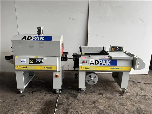 SMIPack FP560A L sealer and shrink tunnel, 2011, Semi auto L sealer, sealing bar 560mm x 430mm, max pack height 230mm, up to 1500 packs per hour, mobile, 1ph, then feeds onto SMIPack T450 shrink tunnel, adjustable temp and speed controls, mobile, 3Ph