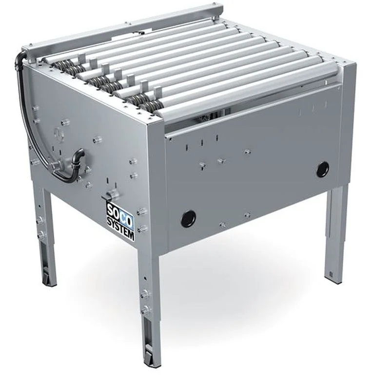 The items are pushed by means of 'fingers' that are led up between the rollers. The 'fingers' then return to their position under the top edge of the rollers.