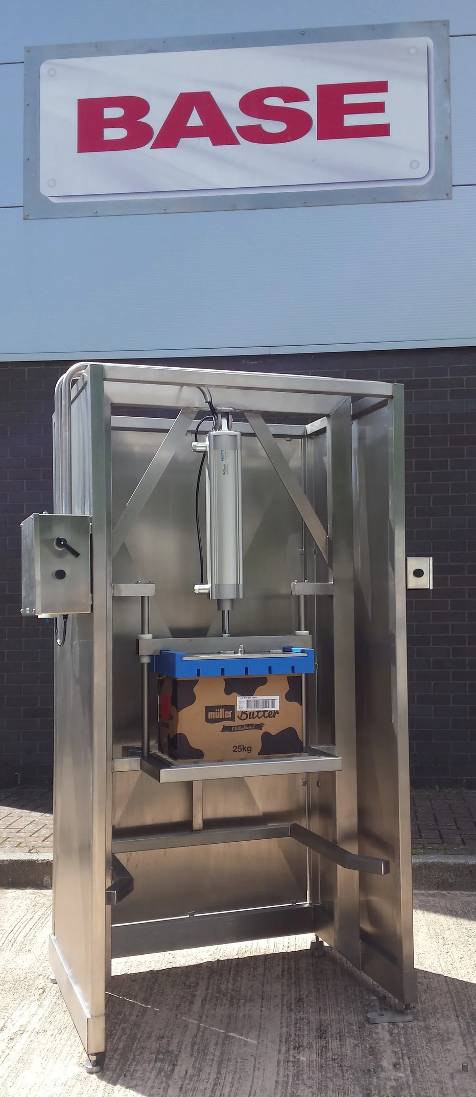 Stainless Steel Butter Block CutterThis Butter Block Cutter was designed to cut tempered blocks of butter into 75 x 75mm segments. To cut the butter into blocks, they would need to be turned through 90 degrees and placed back onto the cutting frame for the second cut. The Butter Block Cutter is manufactured from Grade 304 Stainless Steel throughout and the cutting operation is via a guided pneumatic cylinder and pusher plate. When the cylinder extends it pressing the butter through the cutting blades and into a tote bin placed underneath. The Butter Block Cutter is enclosed in a stainless sheet metal design on both sides and the back with the front open to allow the butter blocks to be loaded and unloaded. Control of the cutting operation is via dual pneumatic push button control mounted either side of the opening at the front. The cut and retract operations are on a hold to run principle with separate dual push buttons for each operation i.e. one pair to cut and another pair to retract. All parts of the Butter Block Cutter and components such as the butter pushing block and the cross blade cutting frame will be easily removable for cleaning purposes. The whole Butter Block Cutter is mounted on stainless steel rubber based adjustable feet which can be used to level the machine once in position. Butter Block Cutter Application StoryThis Butter Block Cutter was required to help prevent damage to the mixing blades in an industrial mixer caused when complete blocks of butter were loaded. The complete block was heavy enough to bend and break the mixer blades when it was dropped into the mixer. By cutting the butter into 75 x 75mm segments no further damage was caused. In addition, when the butter blocks were cut into segments, they melted more quickly in the process and thereby reduced the cycle time for the preparation of mash potato. Frequently Asked QuestionsWhat is the range of temperatures that the cutter will accept? Basically the colder the block of butter, the longer it will take to cut and if it is still frozen, it will not cut until it has thawed somewhat. We cannot be specific about how long this might take because there are too many variables involved, such as the starting temperature of the block, the block size, the ambient temperature etc. When a 400 x 300 x 300mm Butter Block has reached a temperature of over 5° Celsius, at its core, the block takes approximately 15 seconds to cut. It should be noted that if a frozen block is loaded to the machine, damage to the machine is possible How many blocks per hour will the machine handle? If it is assumed that we are using a similar block size at a similar temperature and estimate an unwrapping and loading time of 45 seconds, then the throughput would be around 60 blocks per hour. What are the cut sizes achieved by the cutter? The normal cutting frame aperture size is 75 x 75mm although this can be adjusted, at the time of manufacturer to suit specific requirements What is the air consumption per cut? Approximately 80 Litres/Minute |
