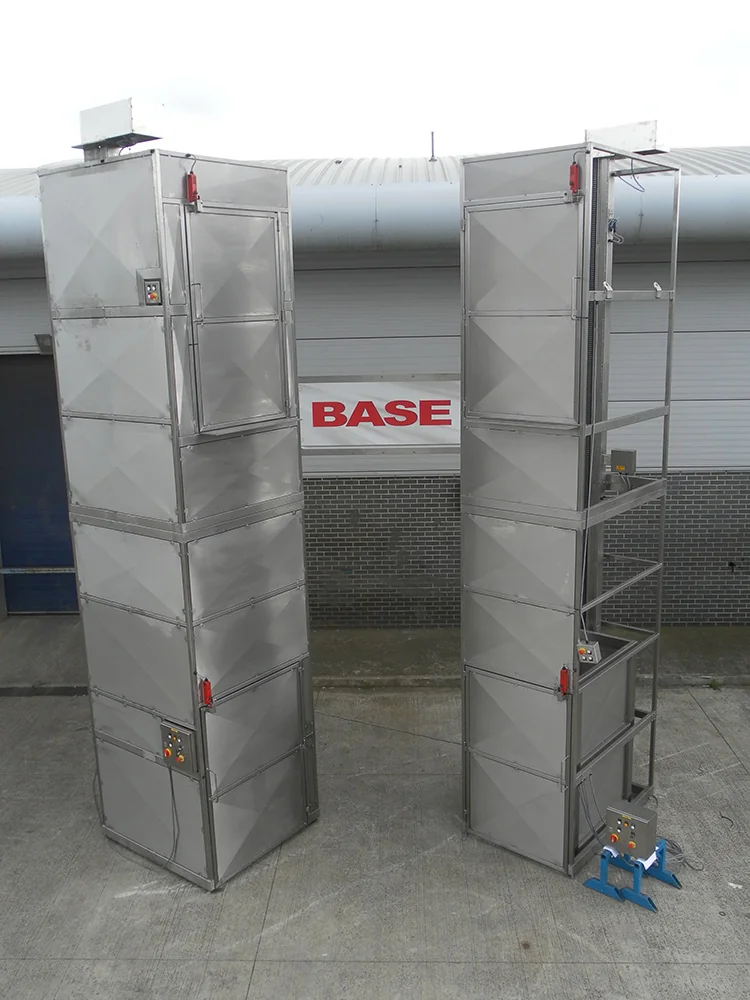 Stainless Steel Goods LiftThis Stainless Steel Goods Lift is a single pillar machine with a Safe Working Load of 300 Kgs and a lift height of 4140mm. The lifting platform was 900 x 1200mm to allow a mobile trolley to be wheeled onto the lifting platform. At the upper level, there was a landing plate to allow easy unloading. The Stainless Steel Goods Lift is constructed from Grade 304 stainless steel and is bolted to the floor and braced at the upper level. Lifting with the Stainless Steel Goods Lift is accomplished via a ¾” Duplex Chain driven by a motor gearbox mounted at the top of the main column. Safety Guard To PD 5304 Safety of MachineryThe safety guard is constructed from 40 x 40 x 3mm stainless steel box section and 2mm stainless steel on the front face only. The Stainless Steel Goods Lift was installed into an alcove and clad by others with foodsafe sandwich panels on both sides and the back to meet the requirements of PD 5304 Safety of Machinery. The guarding and cladding enclosed the Stainless Steel Goods Lift to a height of 6340mm with a hinged door at each level through which the trolleys were loaded and unloaded. Each door is electrically interlocked to prevent the Stainless Steel Goods Lift being operated with a door open and in addition, the doors are mechanically locked closed whilst the Stainless Steel Goods Lift is running. Each door may only be opened when the lifting carriage is at the appropriate level. |