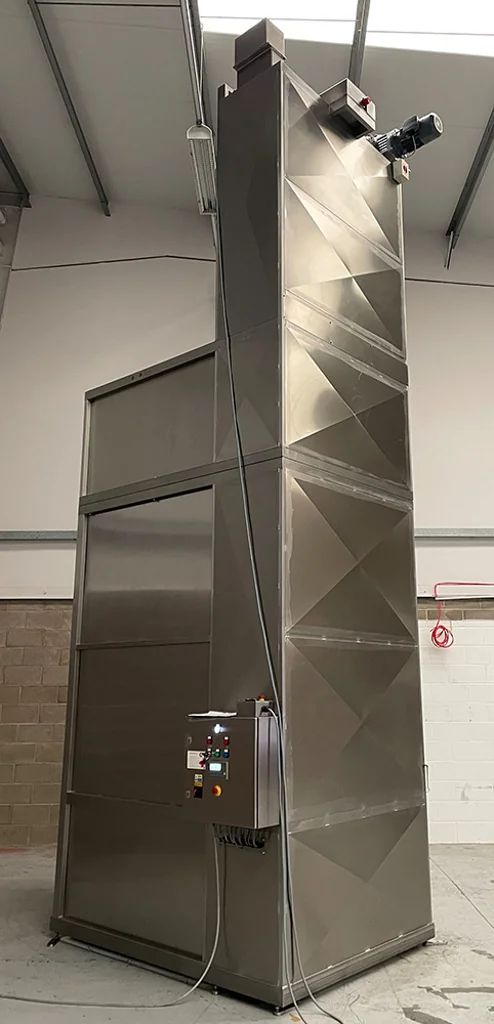 PLM/2P/1000/4210/B/G Double Pillar Stainless Steel Pallet LiftThis Stainless Steel Pallet Lift has a Safe Working Load of 1000 Kgs and a lift height of 4210mm. The Stainless Steel Pallet Lift is designed to lift a Pallet of sacks to an upper level where there is a barrier over which the layers of sacks are unloaded by hand. The lifting platform is big enough to allow a standard pallet (1200 x 1000mm) to be loaded using a fork lift truck. The Stainless Steel Pallet Lift was manufactured from Grade 304 stainless steel, is a welded construction throughout and is designed to be bolted to the floor without the need for a pit. The lifting is accomplished via chains driven by a motor gearbox mounted at the top of the one column with a crossover shaft to the other column. Safety Guard to BS EN 14120:2015 Safety of Machinery GuardsThis Stainless Steel Pallet Lift was supplied complete with a safety guard to meet the guidelines of PD 5304 Safety of Machinery. The safety guard is constructed from 40 x 40 x 3mm stainless steel box section and 2.0mm stainless steel sheet. The guard reached to a height of 1000mm above the upper floor level. At the lower level there are a pair of hinged doors through which the Stainless Steel Pallet Lift can be loaded and unloaded. Each door is electrically interlocked to prevent the machine being operated with a door open and in addition, the doors are mechanically locked closed whilst the machine is running. Each door may only be opened when the lifting carriage is at the full down position. Stainless Steel Pallet Lift Electrical ControlThis Stainless Steel Pallet Lift is fitted with an IP65 Stainless Steel Control Panel which is mounted on the safety guard at a convenient position to give good maintenance access under the Provision and Use of Work Equipment Regulation 1998 (PUWER). The control panel incorporates the following controls; Up, Down, Guard Release, Emergency Stop, Cleaning Key Switch and a Reset Facility. There was a remote Stainless Steel push button station at the upper level incorporating the following controls; Up, Down, Guard Release and Emergency Stop. The remote push button station allows the Stainless Steel Pallet Lift to be inched up so that the each layer of sacks can be unloaded. Dual Upper and Lower end of travel limit switches are positioned to prevent inadvertent adjustment or damage but are easily adjustable by trained personnel for fine adjustment on site. Stainless Steel Pallet Lift Safe Access SystemThis Safe Access System was fitted to the Stainless Steel Pallet Lift during manufacture to allow access to the inside of the safety guard at the lower level for maintenance and housekeeping. The Access System will operate as follows:-