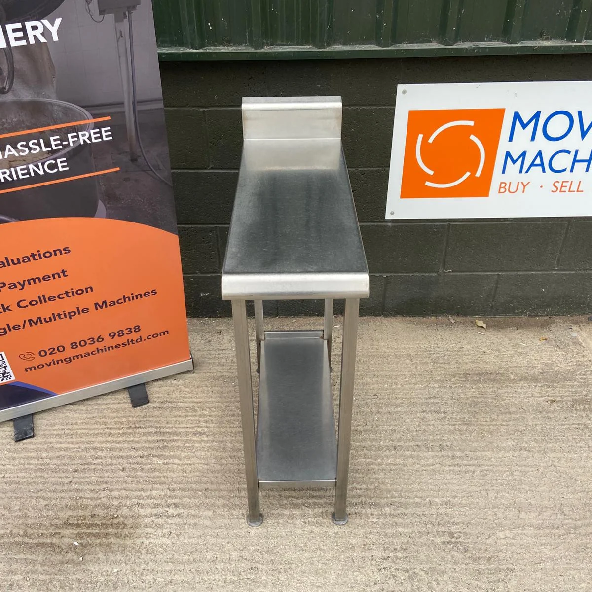 Narrow stainless steel worktable with solid lower shelf with adjustable feet and splash back
