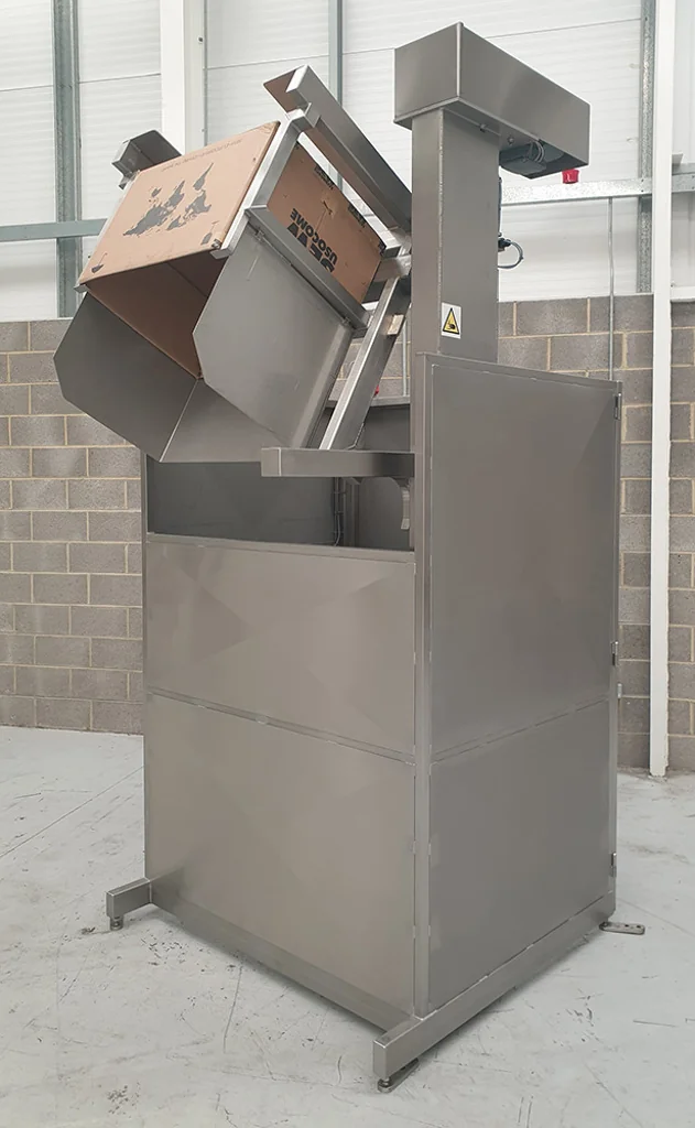 BTM/400/1850/B/G Single Pillar Stillage TipperThis Single Pillar Stillage Tipper is designed to lift and tip at a discharge height of 1850mm. The Stillage Tipper is manufactured from Grade 304 stainless steel, is a welded construction throughout and is designed to be bolted to the floor. The lifting is achieved by a ¾” Duplex chain driven by a motor gearbox mounted at the top of the main column. The parts in the Stillage were discharged into a hopper mounted above a feeder conveyor. Safety Guard to BS EN 14120:2015 Safety of Machinery GuardsThis Single Pillar Stillage Tipper was supplied complete with a safety guard to meet the guidelines of BS EN 14120:2015 Safety of Machinery Guards. The safety guard is constructed from 40 x 40 x 3mm stainless steel box section and 2.0mm stainless steel sheet. It encloses the Stillage Tipper Tipper to a height of 2200mm on three sides, with a hinged guard door on the fourth side. The guard door is electrically and mechanically interlocked |