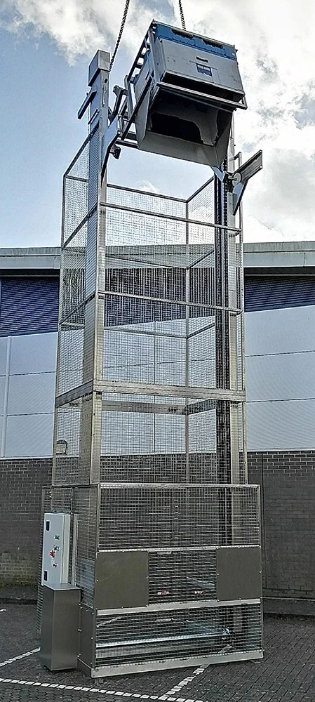 BTM/2P/250/6750/B/G Double Pillar Tobacco Box TipperThis Tobacco Box Tipper is designed to lift and tip a Tobacco Container (1175mm L x 989mm W x 990mm H) weighing 250 Kgs to tip 160° at a discharge height of 6750mm. The Tobacco Box Tipper is constructed from mild steel with a powder coated finish and is designed to be bolted to the floor. The lifting is accomplished via chains driven by a motor gearbox mounted at the bottom of the one column with a crossover shaft to the other column. The Tobacco Box Tipper had a maximum tip angle of 160 degrees. The lift and tip cycle was 95 seconds using an Inverter to accelerate the lift speed during the vertical parts of the travel both up and down. Safety Guard to BS EN 14120:2015 Safety of Machinery GuardsThis Tobacco Box Tipper was supplied complete with a safety guard to meet the guidelines of BS EN 14120:2015 Safety of Machinery Guards. The safety guard is constructed from 40 x 40 x 3mm box section and 40 x 40mm aperture, 3mm wire weld mesh which encloses the Tobacco Box Tipper to a height of 7200mm on three sides and 6000mm at the tipping position. At the loading position there was a side guard each side and a Safety Light Barrier. Tobacco Box Tipper Electrical ControlThis Tobacco Box Tipper is fitted with an IP65 Control Panel which is mounted on the Safety Guard at a convenient position to give good maintenance access under the Provision and Use of Work Equipment Regulation 1998 (PUWER). The control panel incorporated the following controls; Up, Down, Guard Release, Emergency Stop and a Reset Facility. Upper and Lower end of travel limit switches are positioned to prevent inadvertent adjustment or damage but are easily adjustable by trained personnel for fine adjustment on site. Once a bin was loaded and the Start operated, the Tobacco Box Tipper cycle was automatic lifting to the Intermediate Limit Switch position. The rest of the tipping action was controlled by a ‘call to run’ signal from the master control system. If the tipper was receiving a ‘call to run’ signal when it reached the Intermediate Limit Switch position, it continued to the Full Up position and paused at full up for an Engineer adjustable time. Once the product had been discharged, and the pause time expired, the Tobacco Box Tipper returned to the Full Down position. The control panel has a volt free pair of contacts which is used to connect the ‘Call to Run’ signal. |