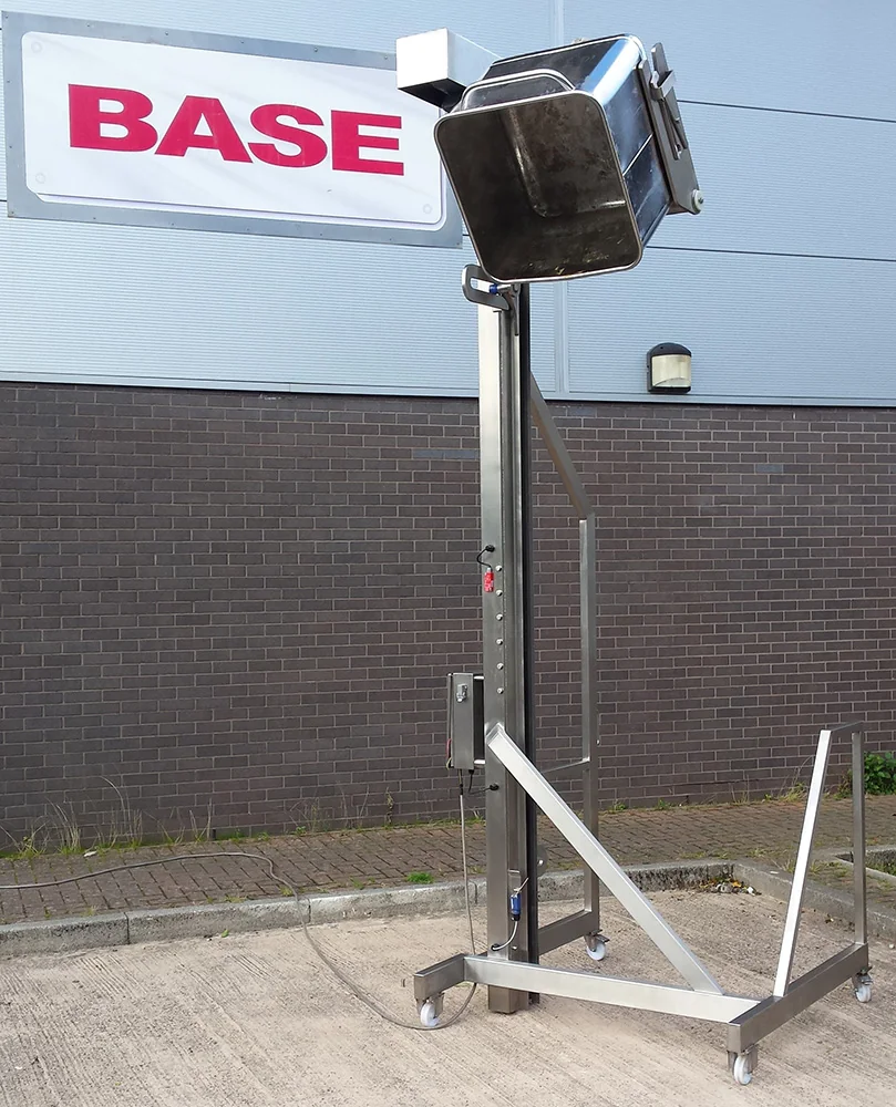 BTM/250//M Single Pillar Tote Bin TipperThis Tote Bin Tipper is designed to lift and tip at a discharge height of 1400mm through the use of a bolt on additional tipping cam and also at a maximum height of 2800mm. Storage of the additional cam will be supplied as a pocket on the side of the main column. When the lower tip height is required the additional cam is bolted in place and the limit switch is plugged in to ensure that the Tote Bin Tipper stops at the correct position. The Tote Bin Tipper is manufactured from Grade 304 stainless steel, is a welded construction throughout and is designed to be mobile on castors. The lifting is achieved by a ¾” Simplex chain driven by a motor gearbox mounted at the top of the main column. The unguarded Tote Bin Tipper is fitted with our unique safety latch which engages automatically in the extremely unlikely event of a lift chain failure. Tote Bin Tipper Electrical ControlThis Tote Bin Tipper is fitted with an IP65 Stainless Steel Control Panel which is mounted on the main column at a convenient position to give good maintenance access under the Provision and Use of Work Equipment Regulation 1998 (PUWER). Upper and Lower end of travel limit switches are positioned on the main column and are easily adjustable by trained personnel for fine adjustment on site. The unguarded Tote Bin Tipper operates on a ‘hold to run’ principle such that the ‘Up’ or ‘Down’ pushbuttons must be held for the Tote Bin Tipper to operate. As soon as either button is released, the Tote Bin Tipper will stop. Installing the lower tipping cam will require the connection of the ‘new’ full up limit switch into the socket provided. Removal of the normal plug will be required to enable the additional limit to be connected in series with the normal full up limit switch. The control panel has a volt free pair of contacts which can be used to connect a ‘Call to Run’ signal if required. |