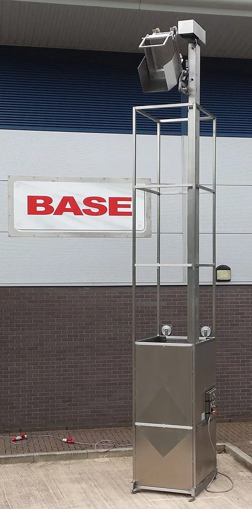Single Pillar Tote Dumper High LevelThis single pillar Tote Dumper High Level is designed to lift and tip at a Special purpose Tote weighing up to 100 Kgs at a discharge height of 5200mm. The Tote Dumper High Level is constructed from grade 304 stainless steel and is fully Tig welded throughout. The lifting is achieved by a ¾” Simplex chain driven by a motor gearbox mounted at the top of the main column. The Tote Dumper High Level is designed to be bolted to the floor and is braced near the top. Safety Guard to PD 5304:2005 Safety of MachineryThe safety guard is constructed from 40 x 40 x 3mm stainless steel box section and 2mm stainless steel sheet to meet the requirements of pD 5304:2005 Safety of machinery. it would enclose the Tote Dumper High Level to a height of 2200mm on all sides with a vertically opening gate through which the tote is loaded. The guard door is electrically and mechanically interlocked preventing the Tote Dumper High Level from operating with the door open. in addition, the guard door can only be opened when the lifting carriage is at the full down position. The Tote Dumper High Level control system has provision for a ‘call for product’ signal to be connected. Tote Dumper High Level Application StoryThe Tote Dumper High Level was designed to tip pet food into a mixing and packing Line at high level. |