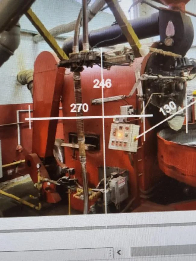 It has come out of production in good working condition, but will require a clean and service before going back into production. This is a solid cast iron double walled drum roaster with brick built firebox under the drum for indirect hot air roasting.
