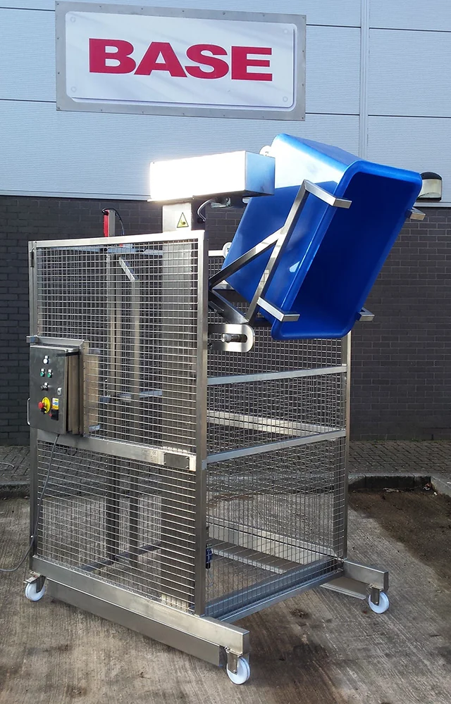 BTM/350/1600/M/G Single Pillar Tray TipperThis Single Pillar Tray Tipper is designed to lift and tip at a discharge height of 1600mm. The Tray Tipper is manufactured from Grade 304 stainless steel, is a welded construction throughout and is designed to be bolted to the floor. The lifting is achieved by a ¾” Simplex chain driven by a motor gearbox mounted at the top of the main column. The Tray Tipper was supplied with two fixed castors at the front and two swivel and brake castors at the rear. Safety Guard to BS EN 14120:2015 Safety of Machinery GuardsThe safety guard is constructed from 40 x 40 x 3mm stainless steel box section and 3mm wire, 40mm aperture stainless steel weld mesh to meet the guidelines of BS EN 14120:2015 Safety of Machinery Guards. It encloses the Tray Tipper to a height of 2200mm on three sides, with a hinged bi-fold guard door on the fourth side. The guard door is electrically and mechanically interlocked preventing the Tray Tipper from operating when the door is open. Additionally, the guard door can only be opened when the lift carriage is at the full down position to prevent access whilst a load is raised. Tray Tipper Electrical ControlThis Tray Tipper is fitted with an IP65 Stainless Steel Control Panel which is mounted on the safety guard at a convenient position to give good maintenance access under the Provision and Use of Work Equipment Regulation 1998 (PUWER). The control panel incorporates the following controls; Start, Guard Release, Emergency Stop and a Reset Facility. The Tray Tipper operation is latched so that pressing the ‘Start’ push button once will raise the lift to the full tip position. The lift will pause at ‘Full Tip’ for a timed period which is Engineer adjustable. Once the product has been discharged the lift carriage will return to the full down position. |
