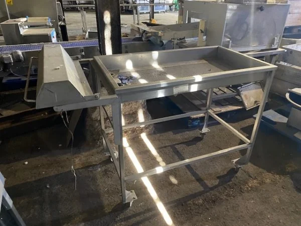 Feature: Mobile Trolley/Feed Table Feature: 63cm x 110cm + 40cm Feature: 98cm height Feature: Stainless Feature: Mounted on wheels Feature: With mesh base for drainage.
