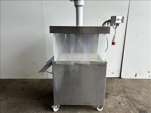 Turbovac TV5575 Dip tank Serial: , stainless dip tank, shrink tank, platform dimensions 730mm x 535mm, dipping length 300mm, max product height 250mm, max water capacity 130l, max product weight 30Kgs, adjustable temp control, exhaust hood, with outfeed conveyor, mobile, 3Ph