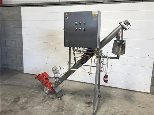 Stainless screw elevator conveyor, screw diameter 100mm, elevates from 500mm to 1400mm, 1.5Kw motor, 3Ph
