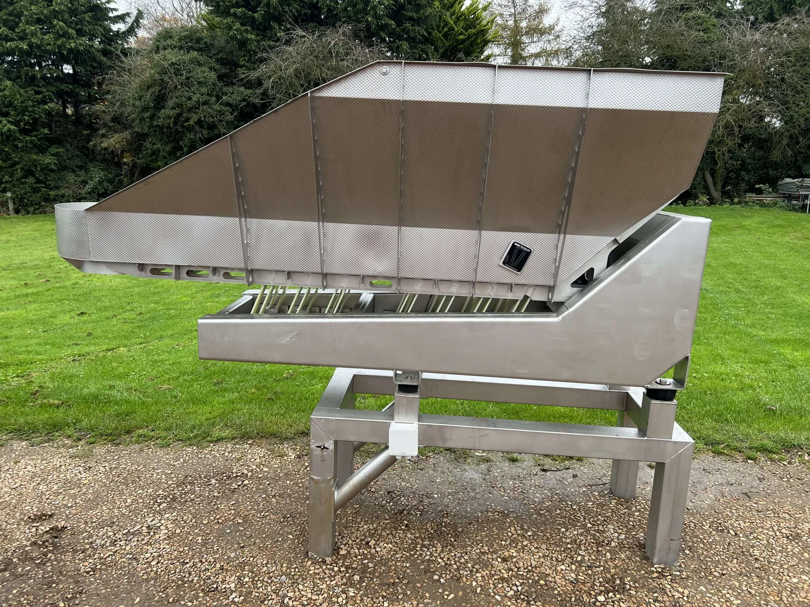 Used vibratory conveyor for sale. Designed to give even product feed into machines such as multi-head weighers. This model has a large funnel design to ensure produce makes it to its final destination without waste.