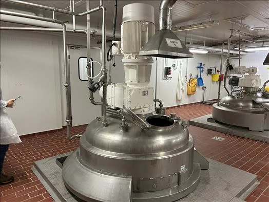 VMI 3500L mixing vessel, 2001, Stainless, 3500L jacketed mixing vessel, top mounted agitation and scrape surface, central high shear mixing shaft, with centrifugal pump, 3Ph