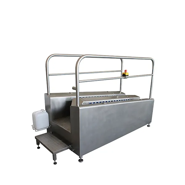 An automatic walk-through boot sole and calf washer for hygienic entrance corridors entering into production areas. For cleaning the sole and calf of footwear. Designed for a high throughput of personnel.
