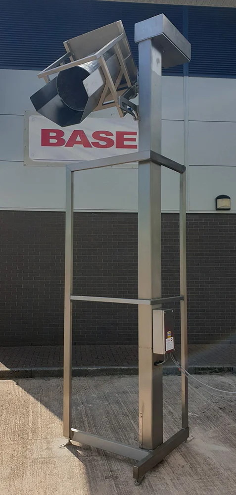 BTM/200/3200/B Single Pillar Waste TipperThis Waste Tipper is designed to lift and tip a recycling waste trash can at a discharge height of 3200mm. The Waste Tipper is manufactured from Grade 304 stainless steel, is a welded construction throughout and is designed to be bolted to the floor. The lifting is achieved by a ¾” Simplex chain driven by a motor gearbox mounted at the top of the main column. The unguarded Waste Tipper is fitted with our unique safety latch which engages automatically in the extremely unlikely event of a lift chain failure. Waste Tipper Electrical ControlThis Waste Tipper is fitted with an IP65 Stainless Steel Terminal Box which is mounted on the main column at a convenient position to give good maintenance access under the Provision and Use of Work Equipment Regulation 1998 (PUWER). The control was incorporated into the Main Control System by others. |