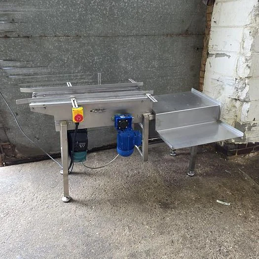 Wire Rack Cooling Conveyor Belt with Guide Rails and Packing Station at the End.