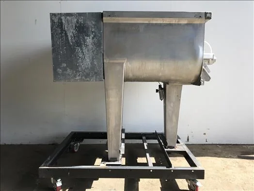 Stainless paddle mixer with continuous ribbon, 600L capacity, pneumatic side doors open to discharge product, 3Ph